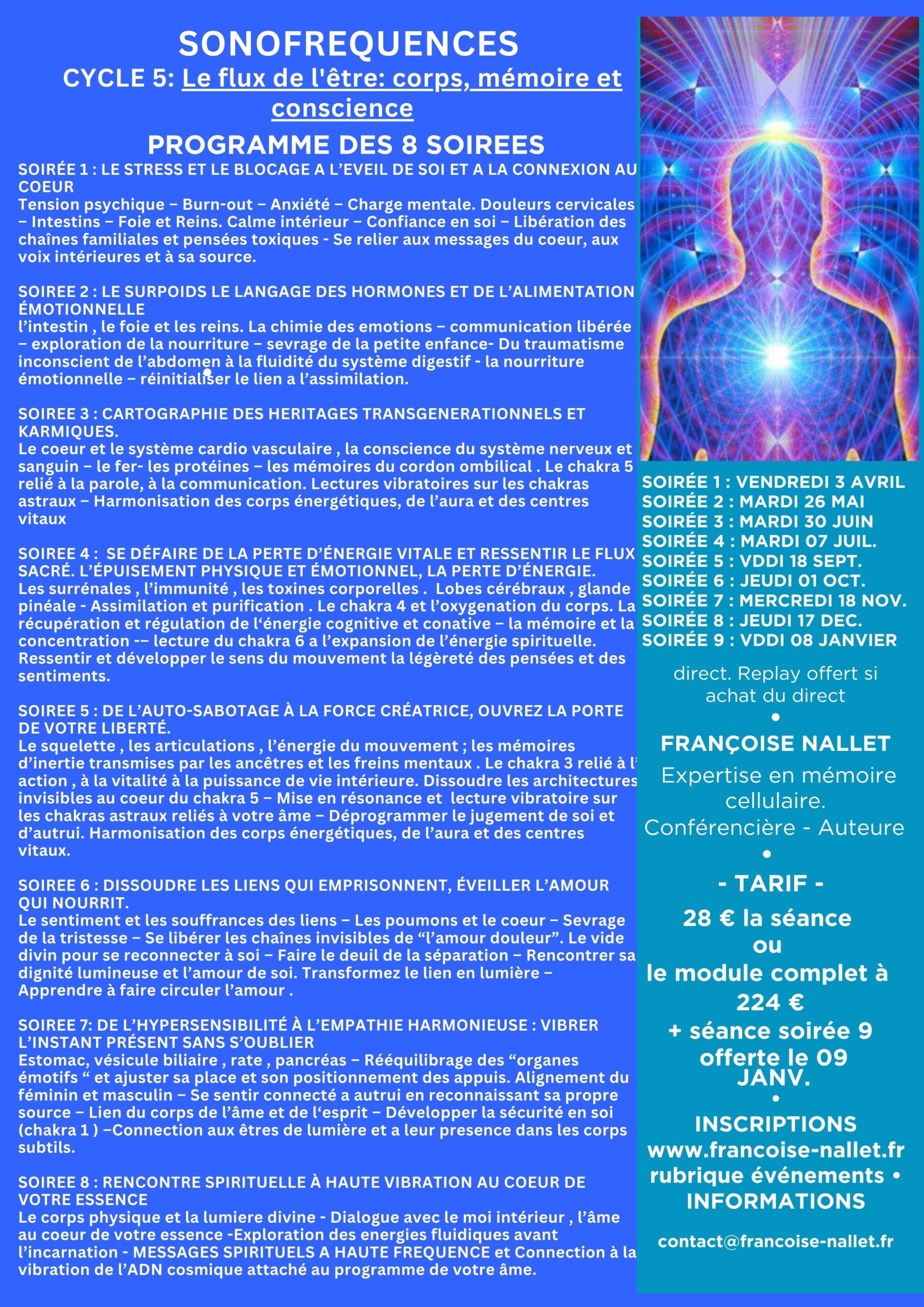 Le coeur et le système cardio vasculaire , la conscience du système nerveux et sanguin – le fer- les protéines – les mémoires du cordon ombilical . Le chakra 5 relié à la parole, à la communication. Lectures vibratoires sur les chakras astraux – Harmonisation des corps énergétiques, de l’aura et des centres vitaux